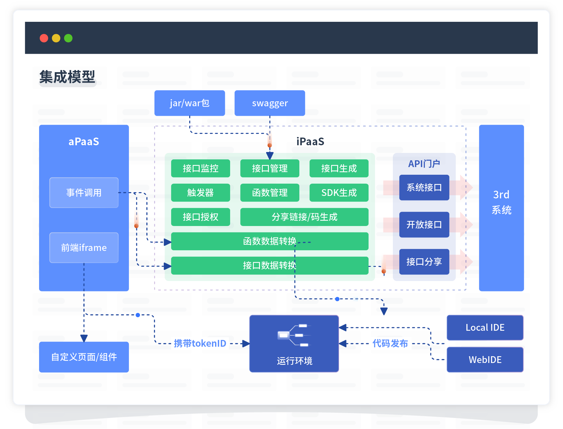 集成模型包括平台本身前、、、、后端能力的扩展,,,,,,,,,也支持通过API门户和第三方系统进行交互。。。。。。。。。。。。。。