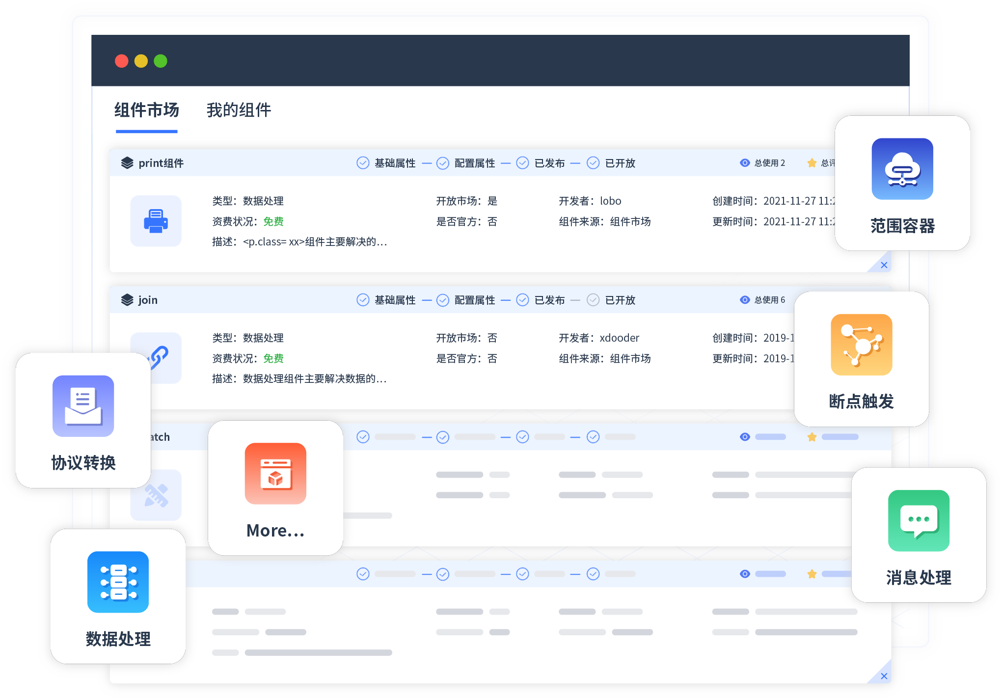 针对集成场景,,,,,,,,,,,小微钱包提供组件市场,,,,,,,,,,,,例如协议转换、、、、、、、、、、、消息处理、、、、、文件操作等。。。。。。。。除平台提供的组件外,,,,,,,客户可以自定义所需组件。。。。。。。。。。。