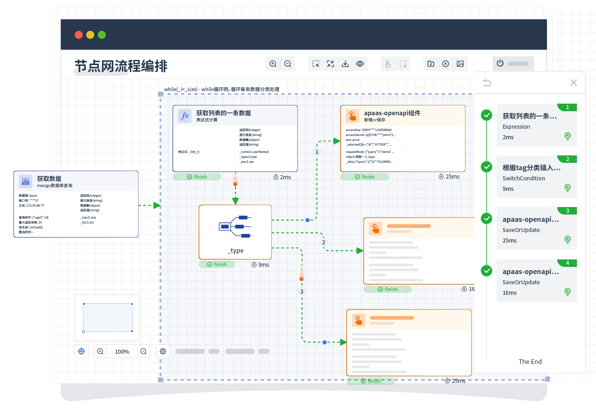 针对集成场景,,,,,,,,,,,,组件定义后支持进行流程编制,,,,,,不同于传统代码方式,,,,,,,,,,,,,通过图形化展示,,,,,,,,,,支持在线调试、、、、、、、、、、、、、、、日志查看和运行回放。。。。。。。